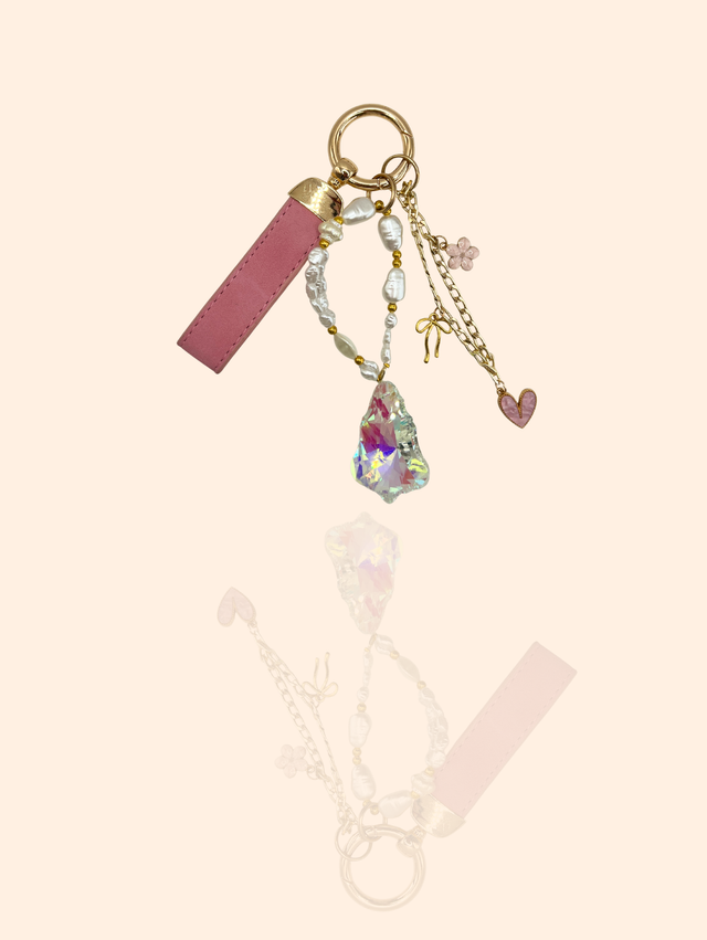 Bijou de sac structuré et lumineux, composé d’une chaîne, de charms et d’un attrape-soleil en verre. Un équilibre entre caractère et élégance.
