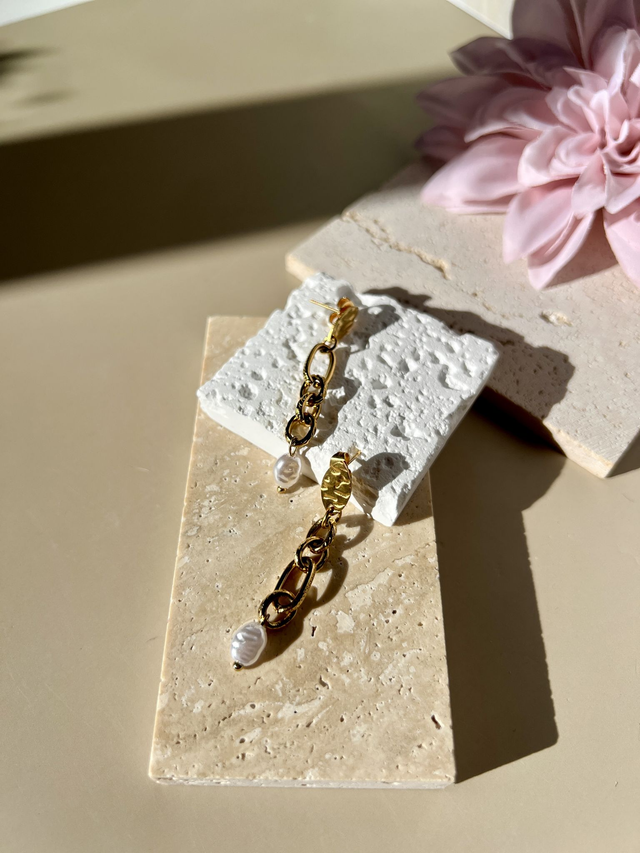 Fines et lumineuses, les "Livia" allient maillons dorés texturés et perles blanches pour une élégance naturelle.