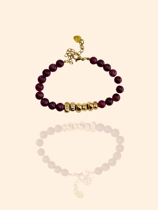 Un bracelet séduisant, composé de perle bordeaux intense et de perles irrégulières doré en son centre, qui attire le regard par son contraste profond et sa composition équilibrée.