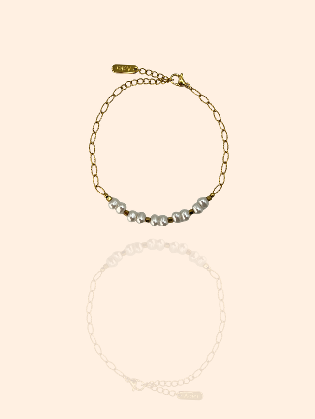 Ce bracelet met en valeur des perles blanches lumineuses, espacés par des détails acier inoxydable doré.