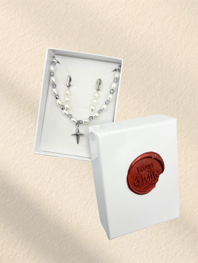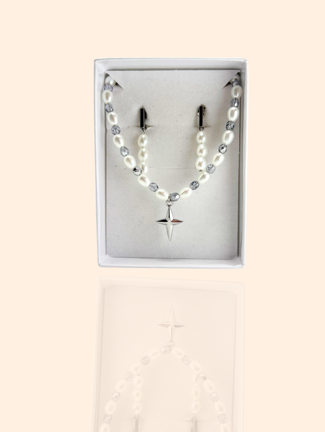 Un coffret pensé comme un ensemble évident : une paire de boucles d’oreilles et un collier qui se répondent naturellement. Des lignes sobres, des détails justes, et une élégance facile à porter au quotidien.