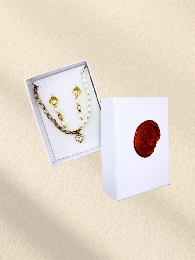 Un coffret pensé comme un ensemble évident : une paire de boucles d’oreilles et un collier qui se répondent naturellement. Des lignes sobres, des détails justes, et une élégance facile à porter au quotidien.