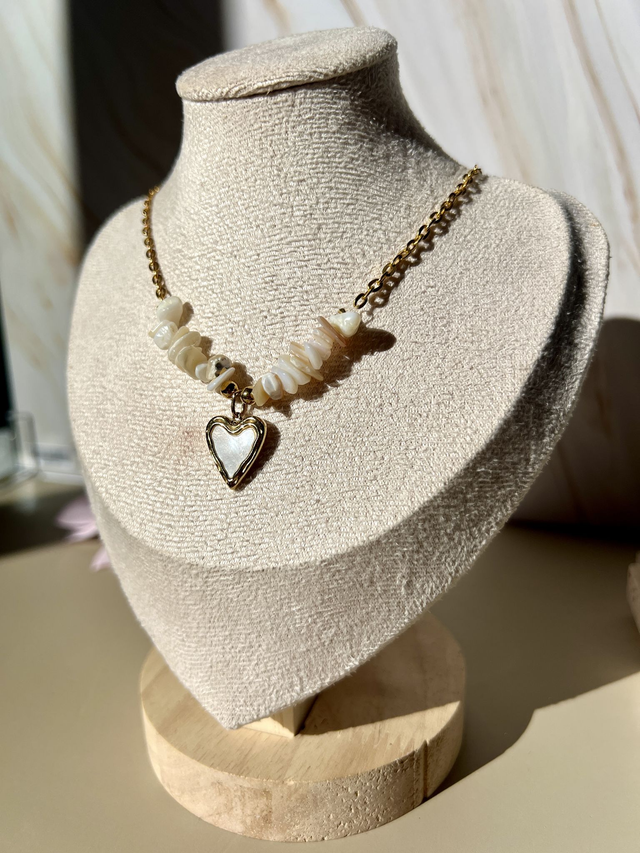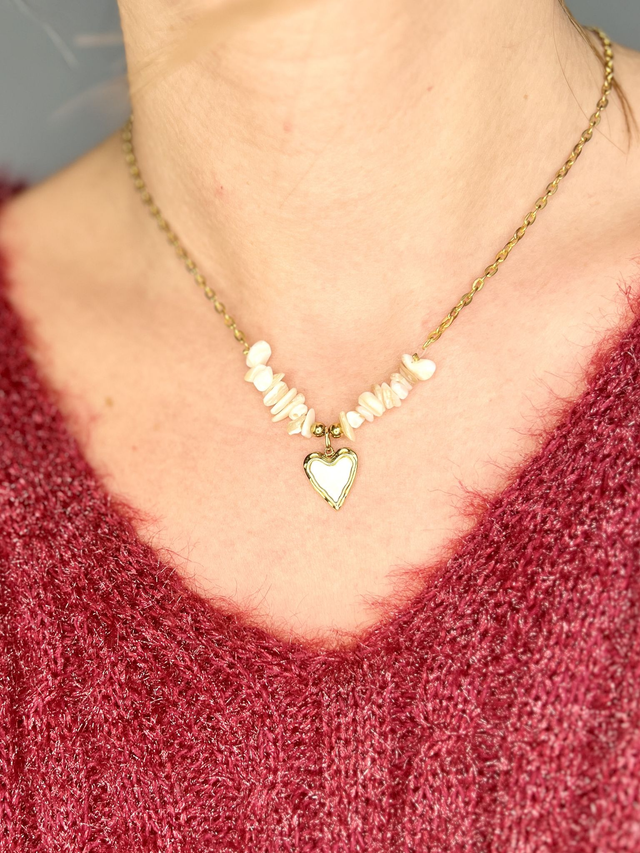 Ce collier associe une chaîne dorée lumineuse à des éclats nacrés, pour un effet brut et raffiné à la fois. Le pendentif cœur, délicatement bordé d’or, reflète la lumière comme un rayon d’été sur la peau.
