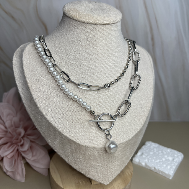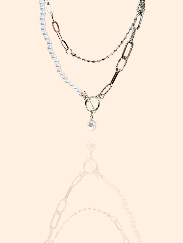Il est composé d’un mélange de perles aux formes et textures variées, associées à une chaîne argentée lumineuse, créant un contraste subtil et raffiné.
