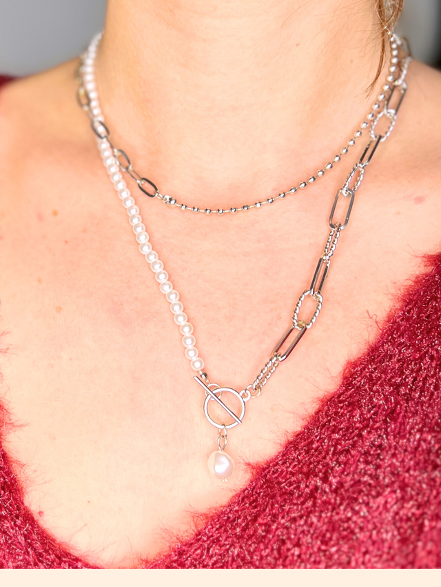 Il est composé d’un mélange de perles aux formes et textures variées, associées à une chaîne argentée lumineuse, créant un contraste subtil et raffiné.
