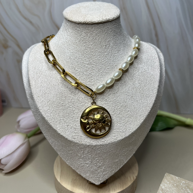 Un côté présente une chaîne à grosses mailles en acier inoxydable, tandis que l'autre est orné de perles blanches allongées et nacrées, ajoutant une touche chic et élégante. Ce bijou est complété par un pendentif lune & soleil, qui apporte lumière et éclat.
