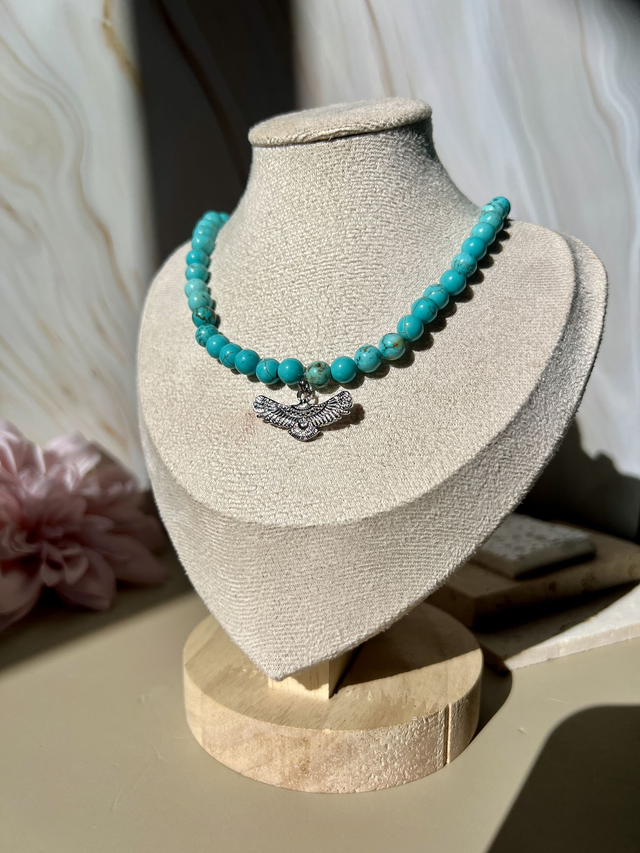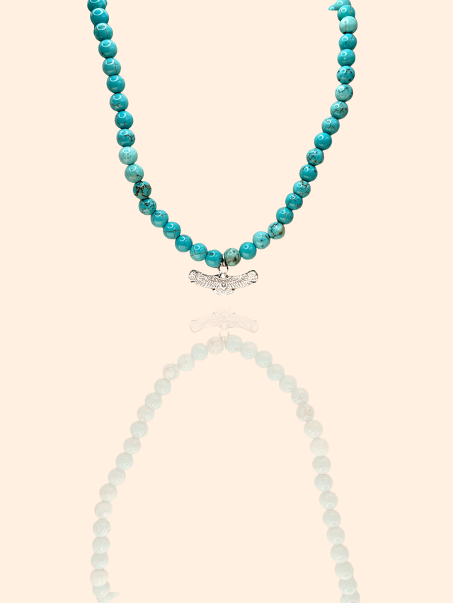 Un collier en perles turquoise éclatantes, sublimé par un pendentif aigle argenté, symbole de force, de liberté et de confiance.