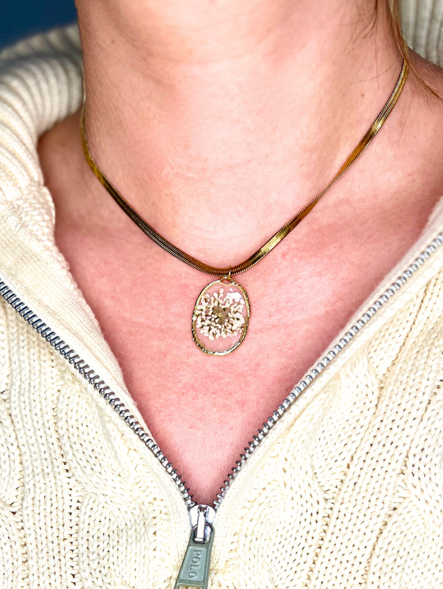 Une chaîne serpent dorée qui brille avec élégance, sublimée par un pendentif fleur capturée dans la résine.