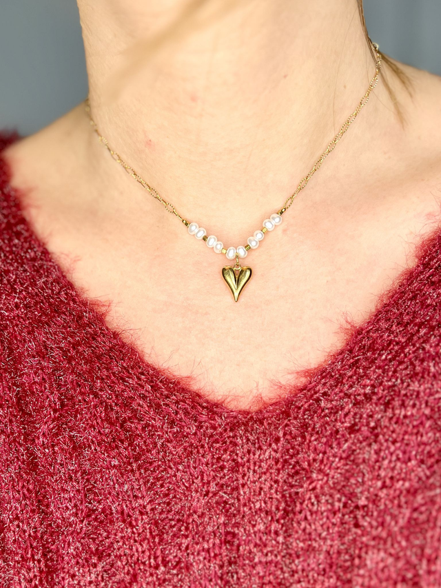 Une fine chaîne dorée qui se pose délicatement autour du cou, ornée de petites perles blanches et d’un cœur central en acier inoxydable qui attire le regard.