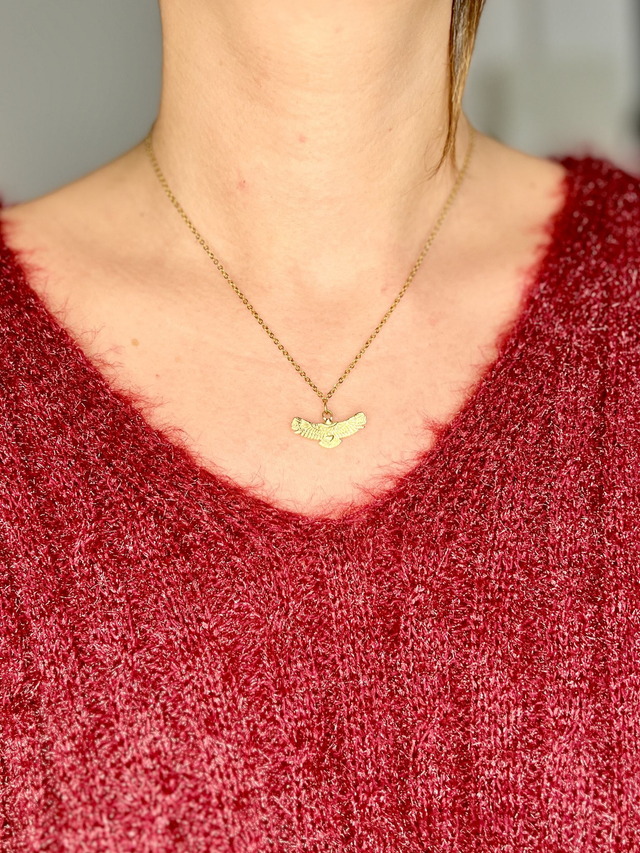 Une chaîne accompagnée d’un pendentif aigle en acier inoxydable, qui capte la lumière et attire le regard.