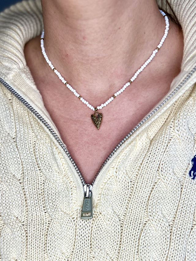 Composé de petites perles blanches et d’un charm central en forme de cœur en acier inoxydable, il incarne l’amour discret, la sensibilité et l’élégance naturelle.