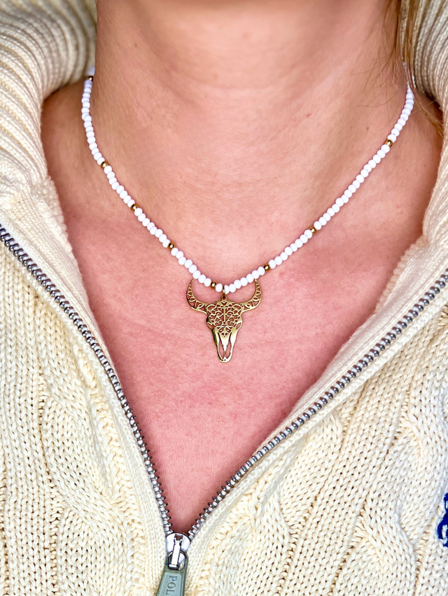 Composé de petites perles blanches et d’un charm central doré en acier inoxydable en forme de taureau, il incarne la force intérieure, la stabilité et la féminité affirmée.