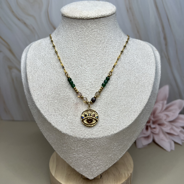 Le collier « LUCKY CHARM » représente à la fois simplicité et originalité. Sa délicate chaîne en acier inoxydable, ses pierres choisis pour leurs couleurs éclatantes , et son pendentif symbolisant la protection et la force en font un bijou d'exception.