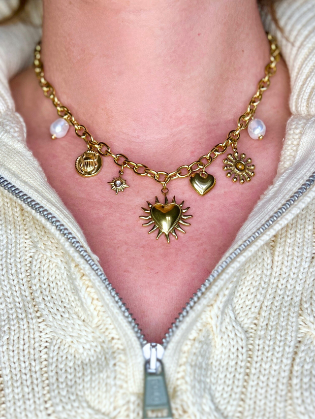 Composé d’une chaîne dorée et de charms soigneusement sélectionnés, il incarne la féminité douce, la lumière intérieure et l’élégance naturelle.