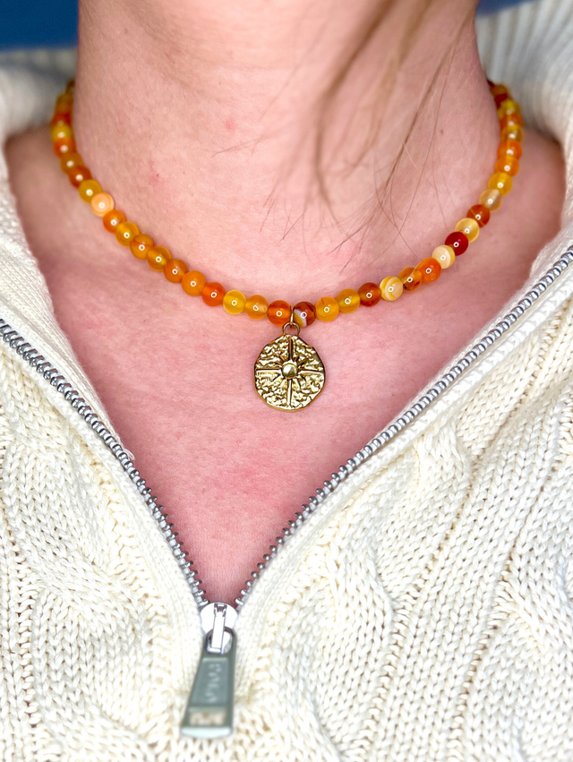 Composé de petites perles orange lumineuses et d’un charm doré texturé en acier inoxydable, il évoque l’énergie, la vitalité et la féminité affirmée.