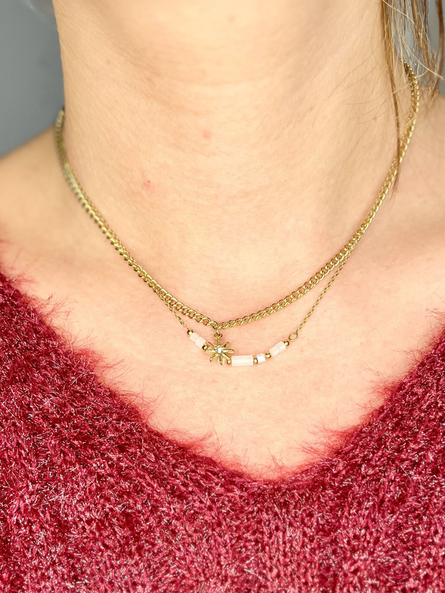 Deux rangs délicats qui s’entrelacent autour du cou : le premier met en avant un pendentif étoile qui capte la lumière et attire le regard, le second, plus fin, est orné au centre de quelques perles de pierre de lune ponctuées de détails dorés.